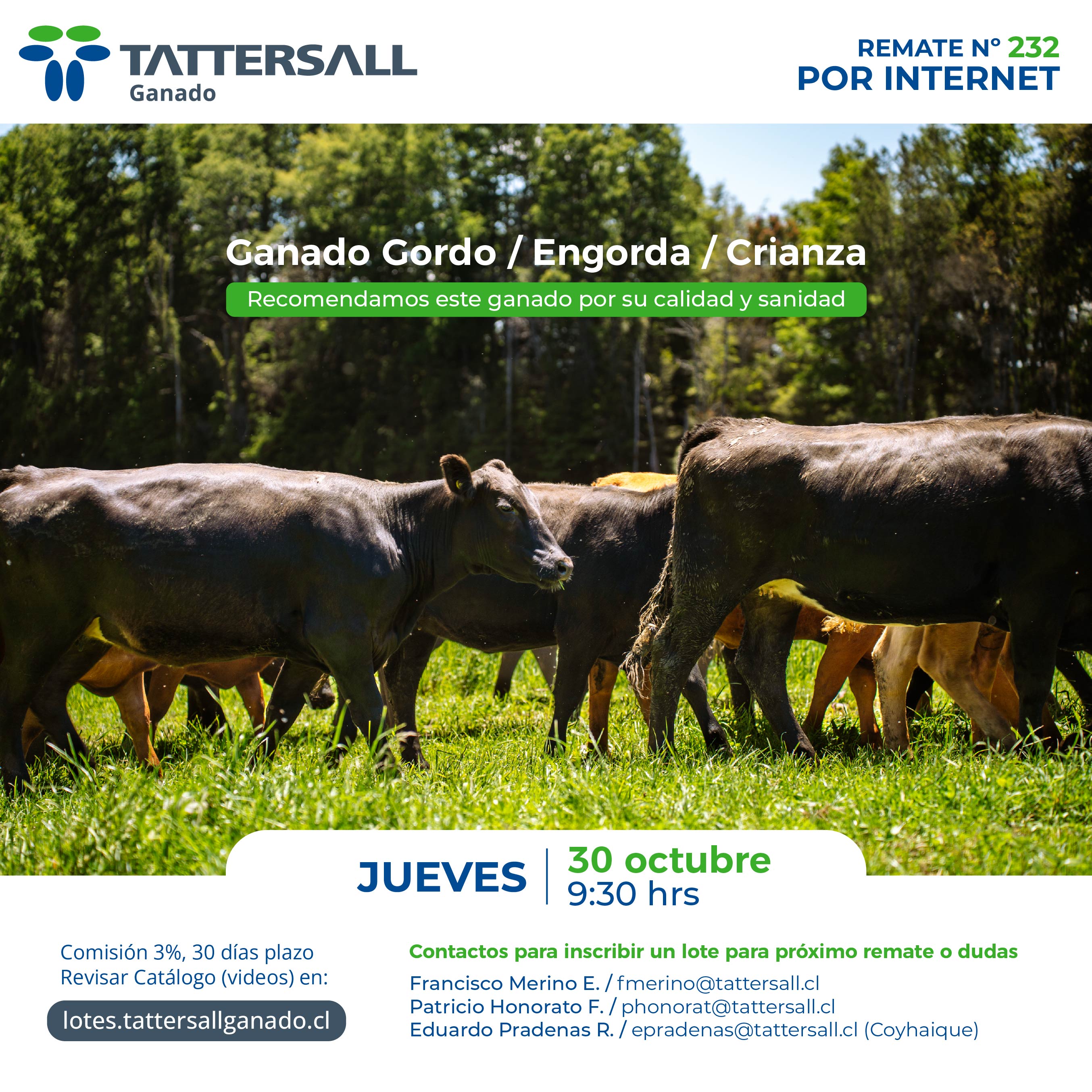 Tattersall Ganado, es una empresa dedicada a la comercialización e intermediación de ganado en sus distintas categorías, principalmente bovinos, ovinos, equinos y cerdos. Nuestros canales de transacción son recintos de ferias, corretaje en privado y comercio electrónico. Nuestra participación de Mercado nacional es de 33%. Nuestra empresa fue fundada en el año 1913, por tanto contamos con una trayectoria de 100 años de experiencia en el mercado agrícola ganadero al servicio de nuestros clientes.