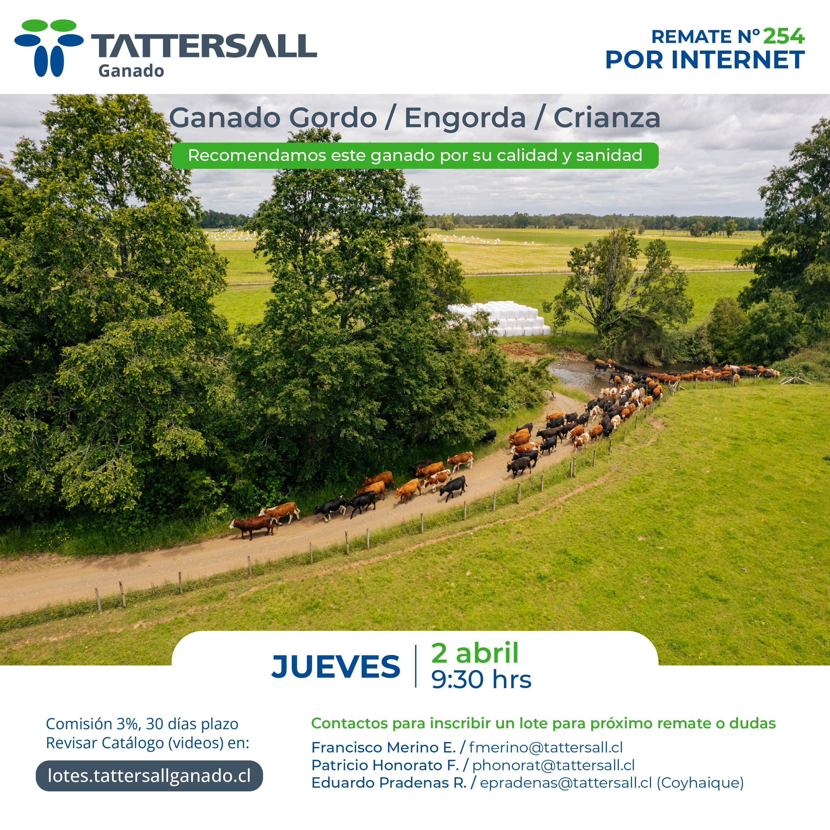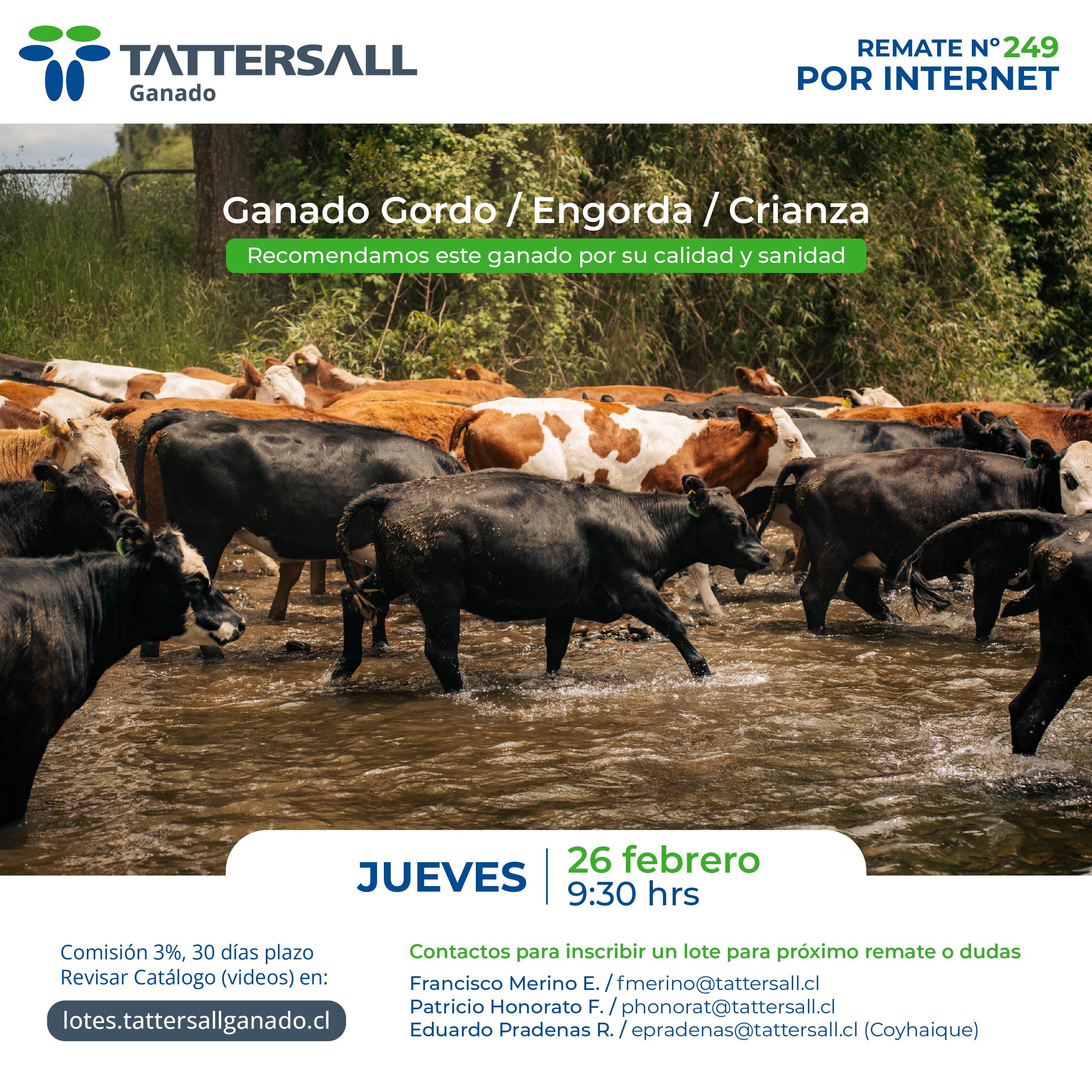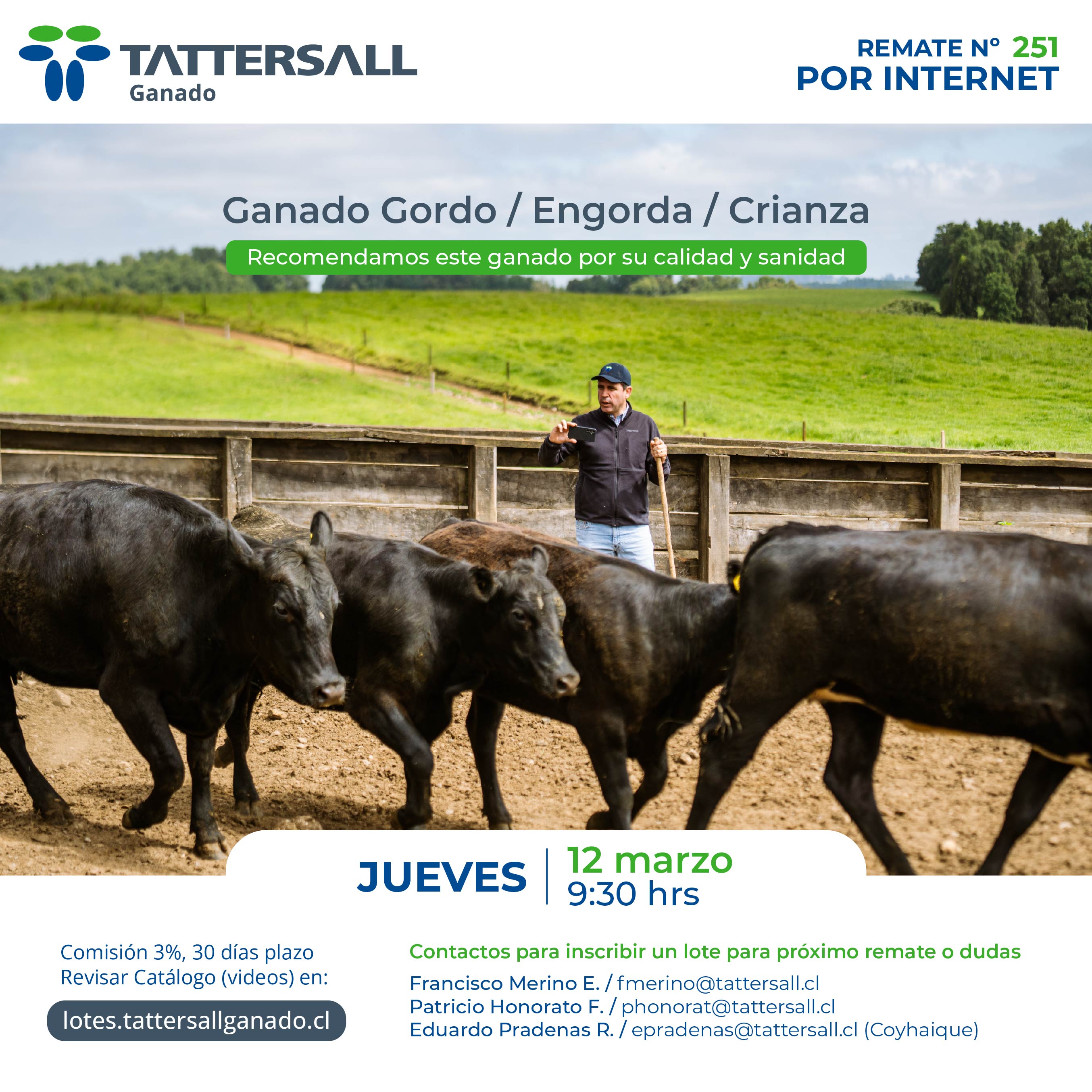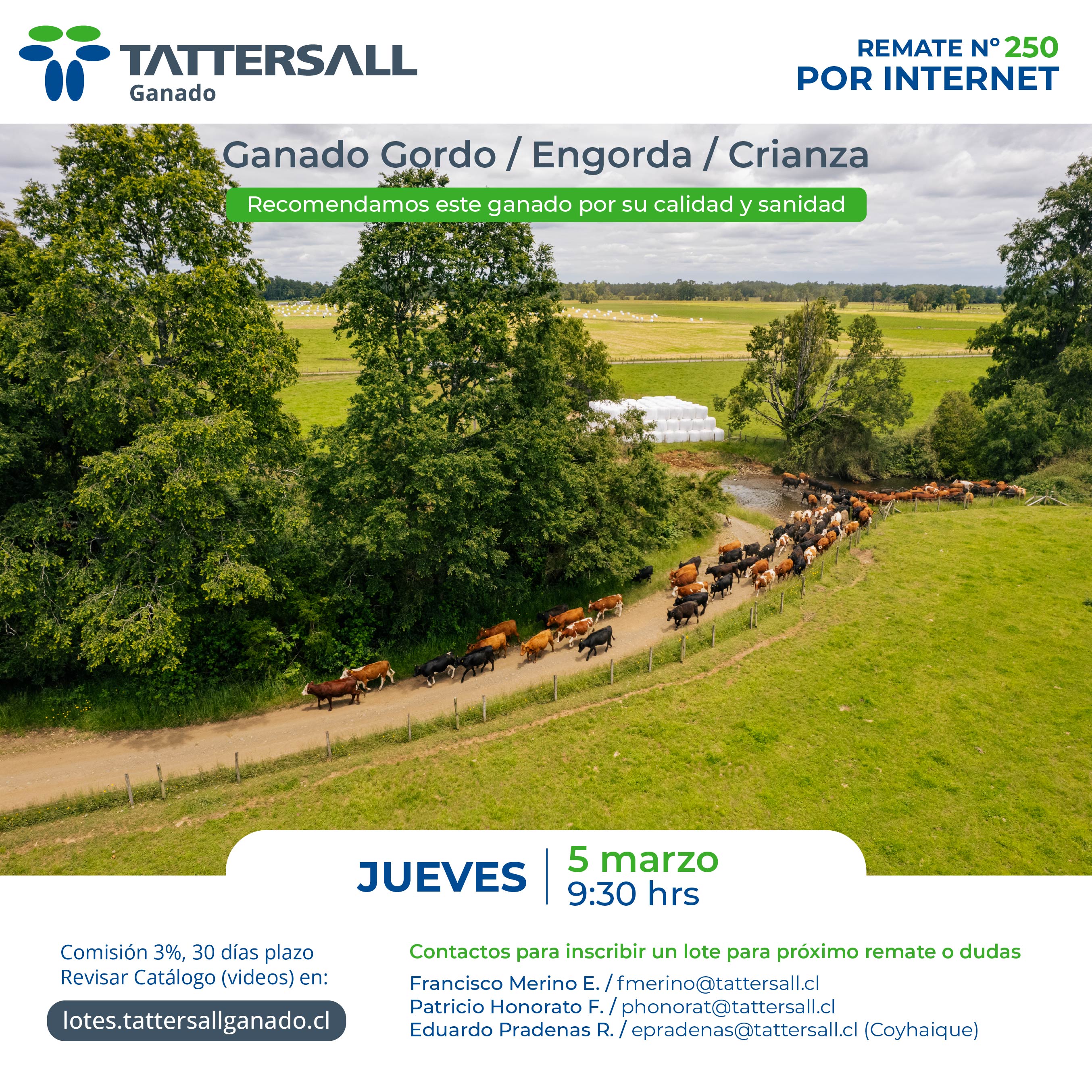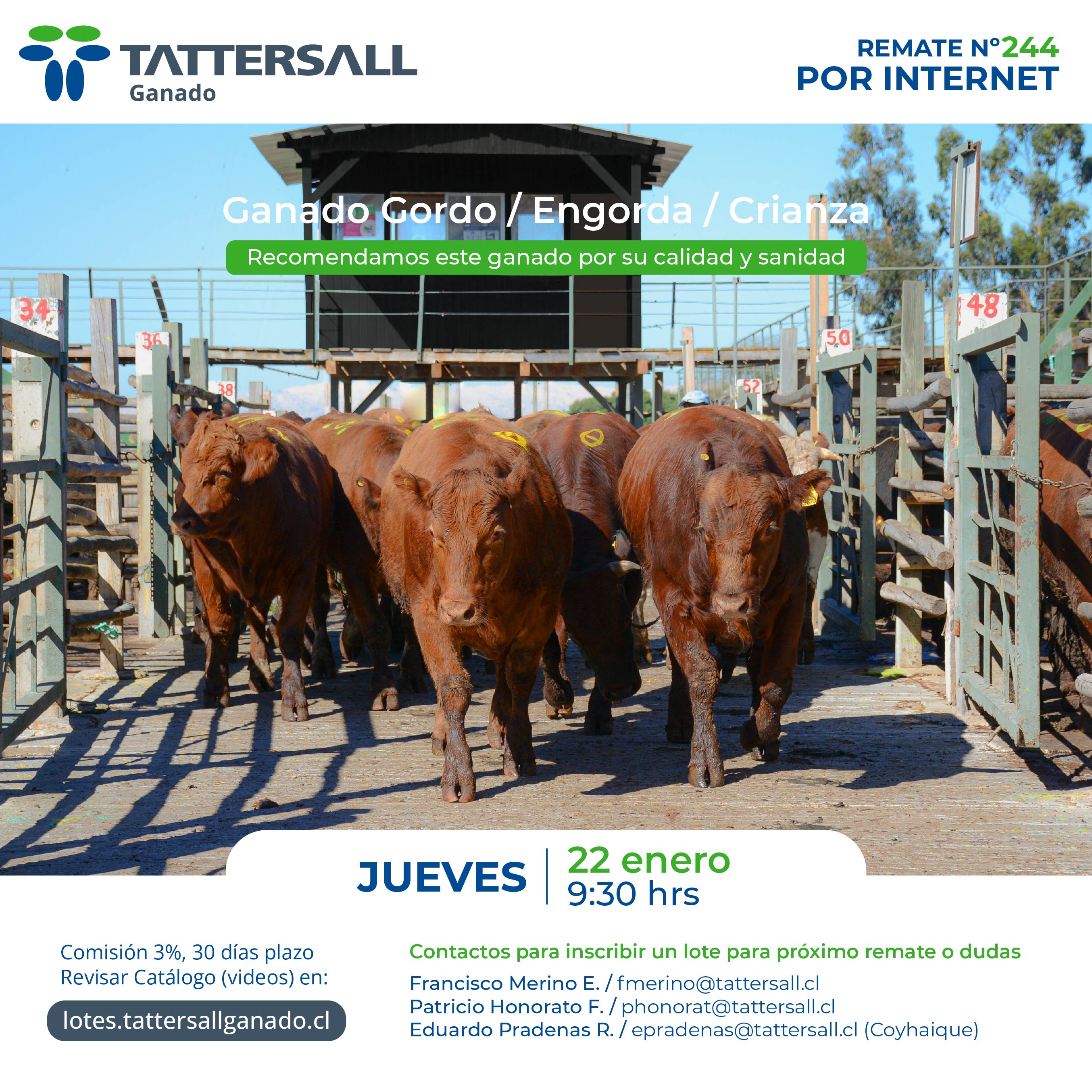 Tattersall Ganado, es una empresa dedicada a la comercialización e intermediación de ganado en sus distintas categorías, principalmente bovinos, ovinos, equinos y cerdos. Nuestros canales de transacción son recintos de ferias, corretaje en privado y comercio electrónico. Nuestra participación de Mercado nacional es de 33%. Nuestra empresa fue fundada en el año 1913, por tanto contamos con una trayectoria de 100 años de experiencia en el mercado agrícola ganadero al servicio de nuestros clientes.