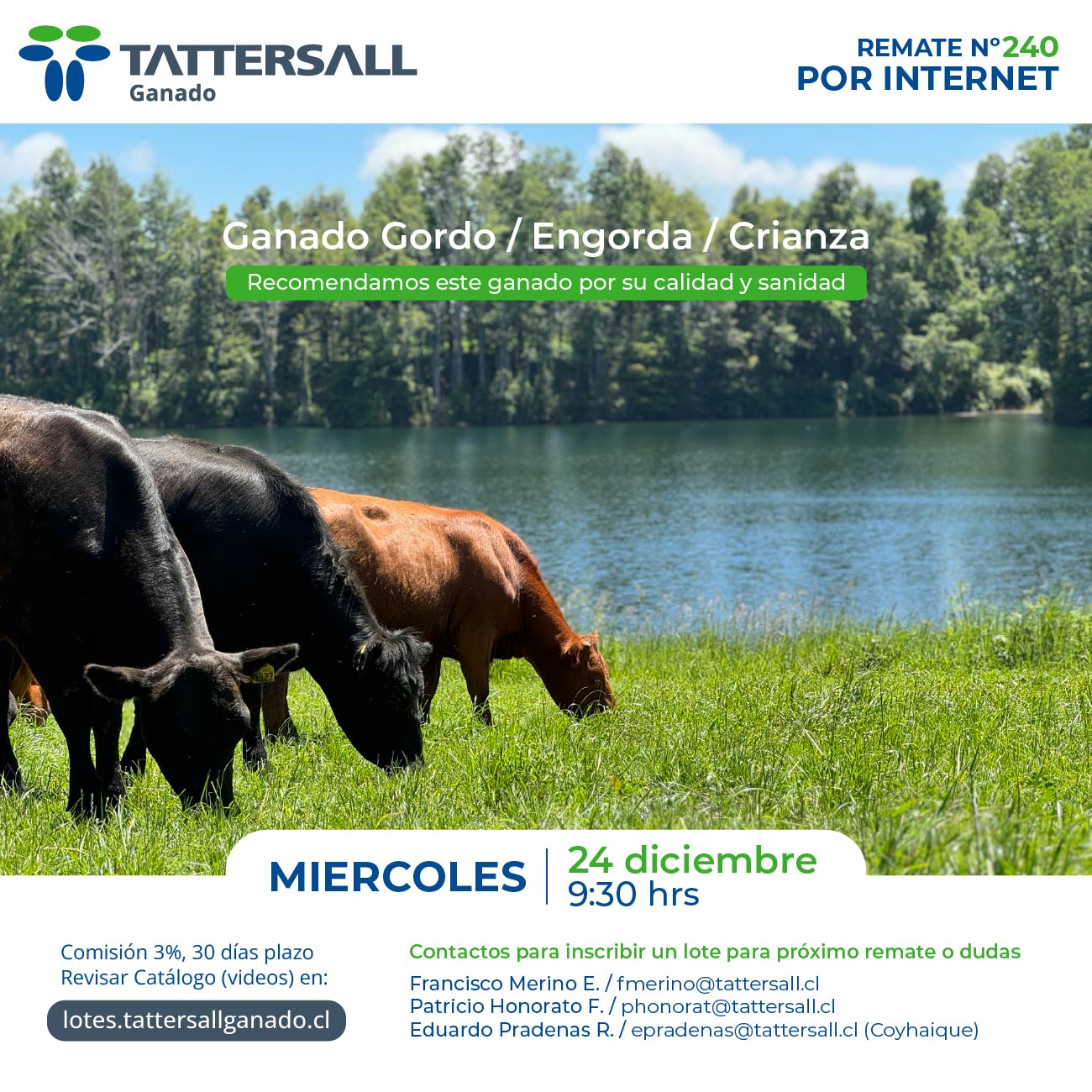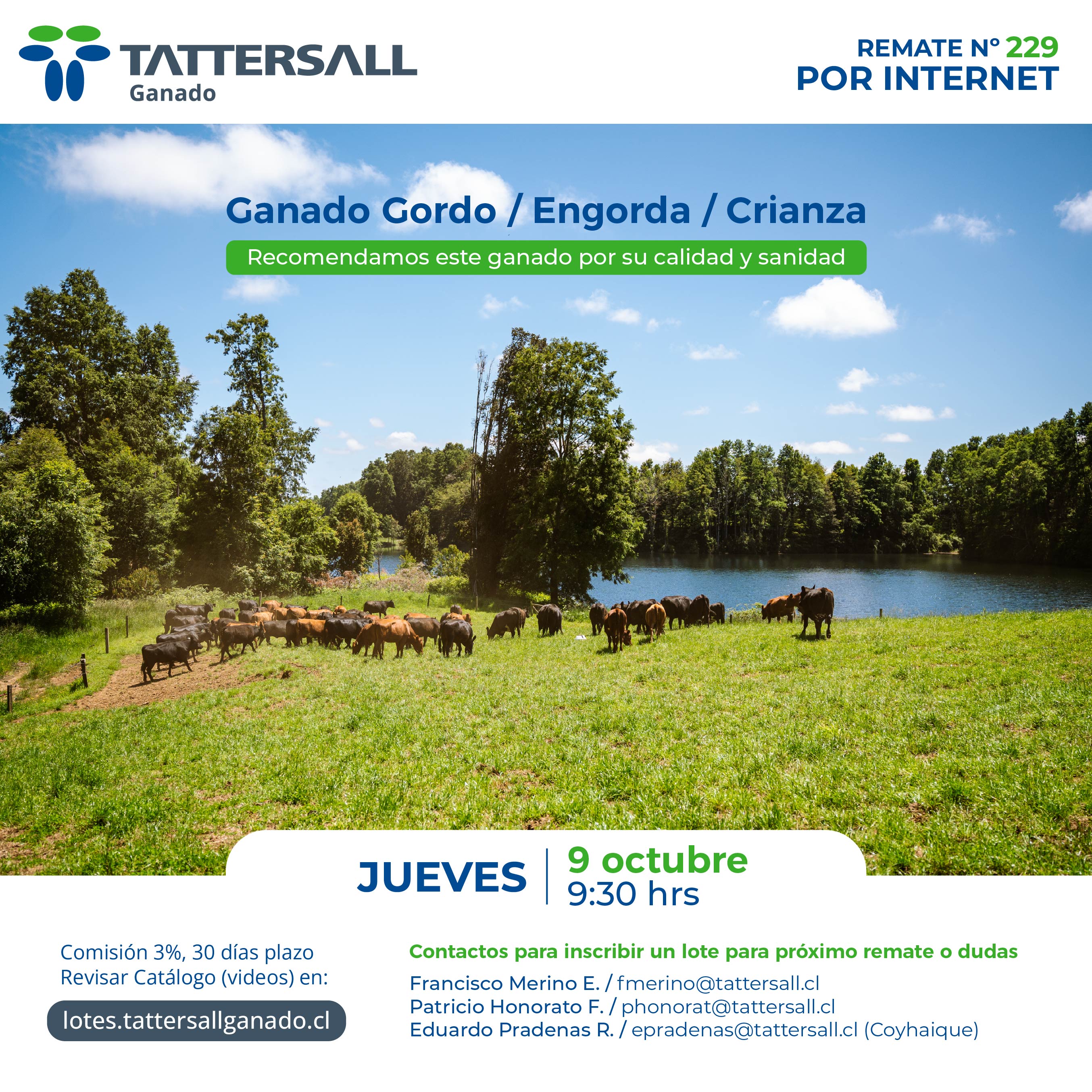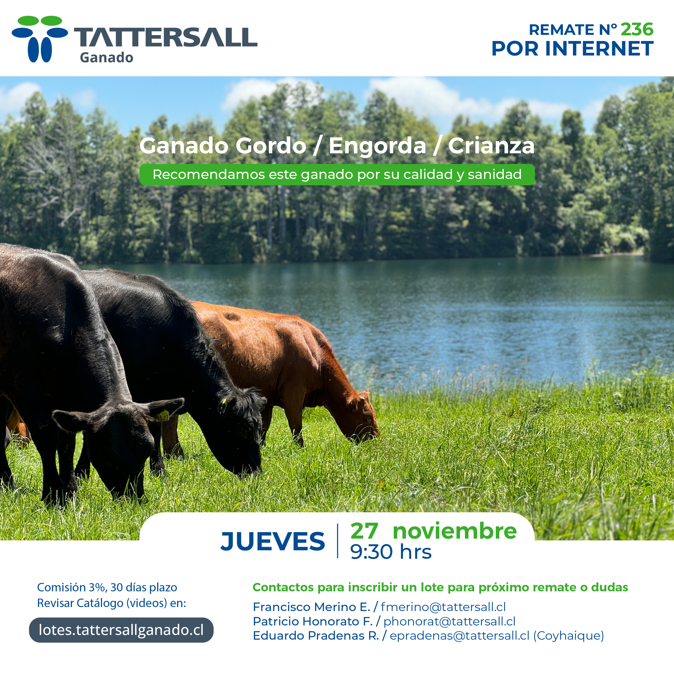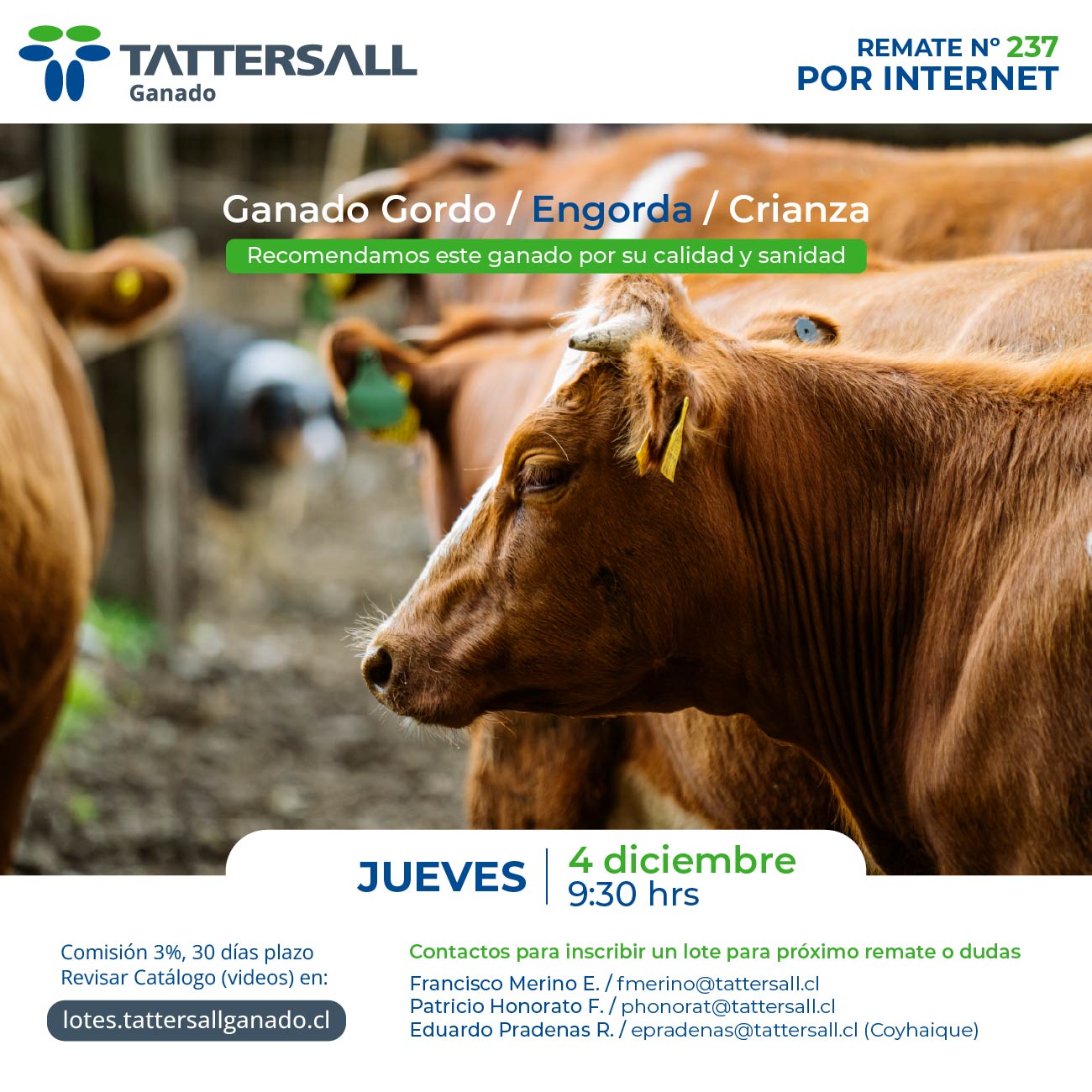 Tattersall Ganado, es una empresa dedicada a la comercialización e intermediación de ganado en sus distintas categorías, principalmente bovinos, ovinos, equinos y cerdos. Nuestros canales de transacción son recintos de ferias, corretaje en privado y comercio electrónico. Nuestra participación de Mercado nacional es de 33%. Nuestra empresa fue fundada en el año 1913, por tanto contamos con una trayectoria de 100 años de experiencia en el mercado agrícola ganadero al servicio de nuestros clientes.